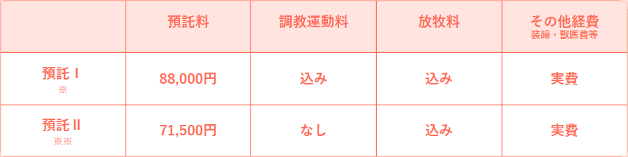 ※自馬持ち込みの場合、当クラブへの入会と入厩料として220,000円を頂きます。